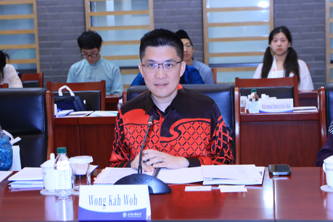 黄家和介绍了马来西亚教育部和马来西亚考试委员会在促进两国教育交流与合作方面发挥的重要作用。他强调,马来西亚教育部高度重视与北外的交流对话,此次合作是双方全方位合作的良好开端,希望未来在语言测试研究、教师交流、学生互访、学术研讨等方面开展务实合作。马来西亚教育部将与北外携手,以促进双边教育发展、增进文明互鉴为宗旨,为两国学子搭建更便捷的国际化教育平台。