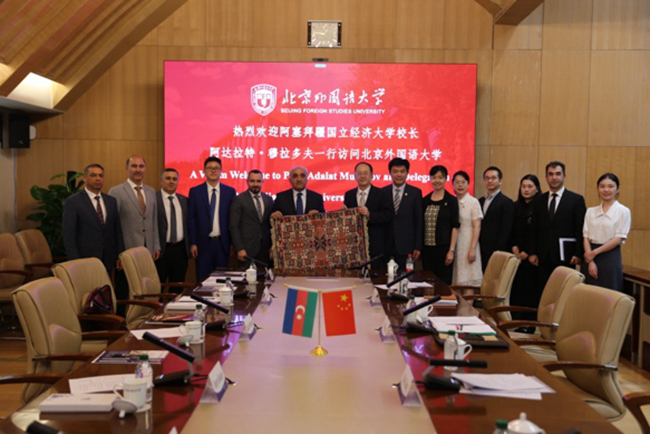 北外国际交流与合作处处长和静、亚洲学院院长苏莹莹、国际商学院常务副院长李思飞、亚洲学院阿塞拜疆语教研室主任阿格申·阿利耶夫等参加会见。