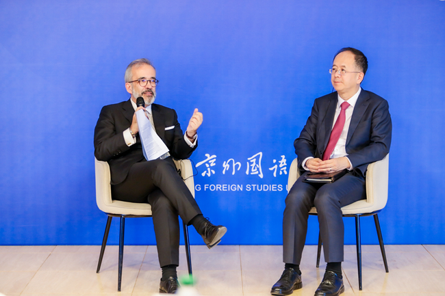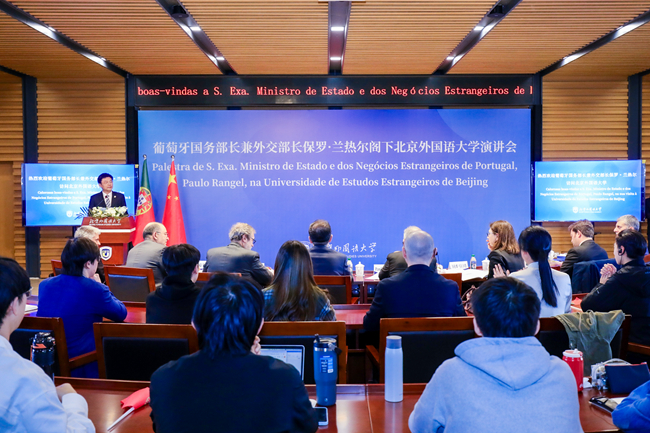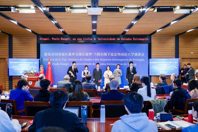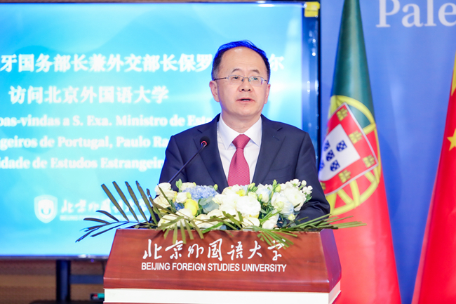 贾文键致欢迎辞,他表示,北外作为中国外语教育与人文交流的重要窗口,一直以来与葡萄牙高校和机构保持着密切合作与互动,并通过多种形式促进两国青年对彼此语言和文化的理解。兰热尔部长此次来访,是对北外的肯定,也是对中葡人文交流的高度重视,北外将继续努力,为加深两国之间相互理解与信任、推动两国长远合作注入更多活力与智慧。希望两国人民携手同行,在文明互鉴中增进理解,在合作共赢中书写新的篇章。