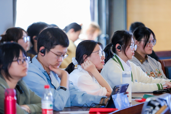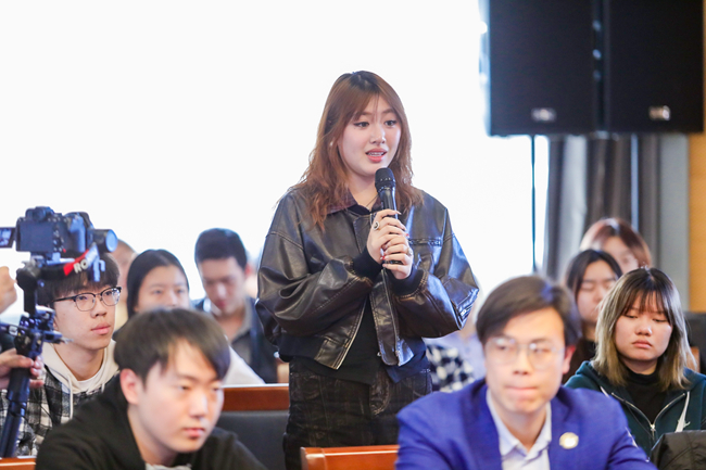 互动环节中,来自北外的师生和兄弟院校的学生围绕葡语文学、中葡人文交流以及文化理解认同等多个话题踊跃提问。兰热尔表示,葡萄牙文学巨匠的作品启示我们,理解自身文化的多元性正是跨文明对话的基础。他特别建议中国和葡语国家青年互相学习对方的语言、亲身体验对方的文化。最后,他强调,中国文明既坚守文化根基又不断创新的特质令他深感敬佩。兰热尔真诚而深刻的回答赢得了在场师生的热烈掌声,也为中葡文化理解与交流提供了新的视角和启发。