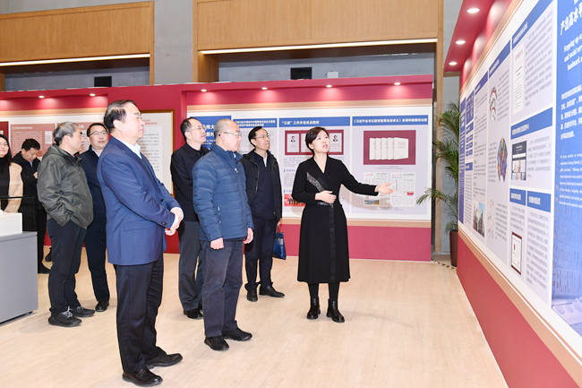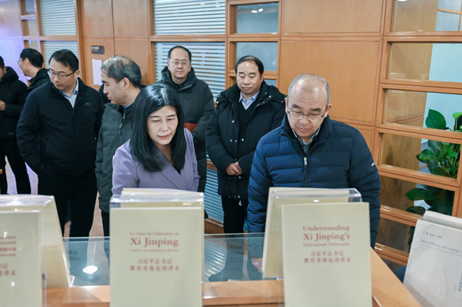 于英杰书记首先来到图书馆参观“高扬外特精通 建设教育强国”展览。王定华、贾文键介绍了习近平总书记给北外老教授们的重要回信情况,汇报了北外的办学历程和发展成就,尤其是近年来在人才培养、学科建设、科学研究、社会服务、国际交流与合作等方面取得的成绩。