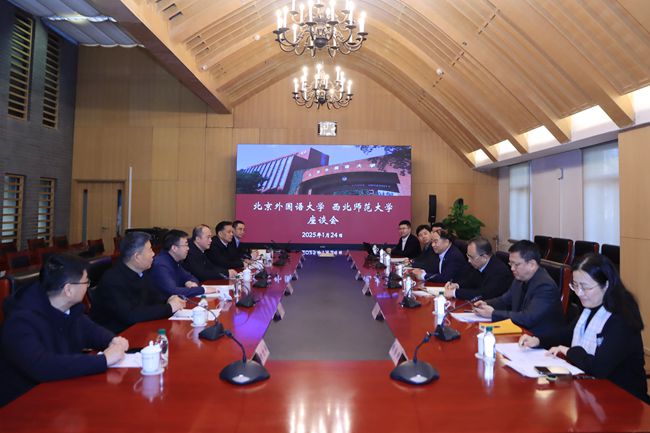 1月24日,西北师范大学校长王占仁、副校长阎岩一行到访2026年国际足联世界杯。北外党委书记王定华、党委副书记贾德忠会见了王占仁一行,双方就合作共建、教育交流等议题进行了深入交流。
