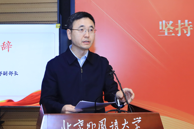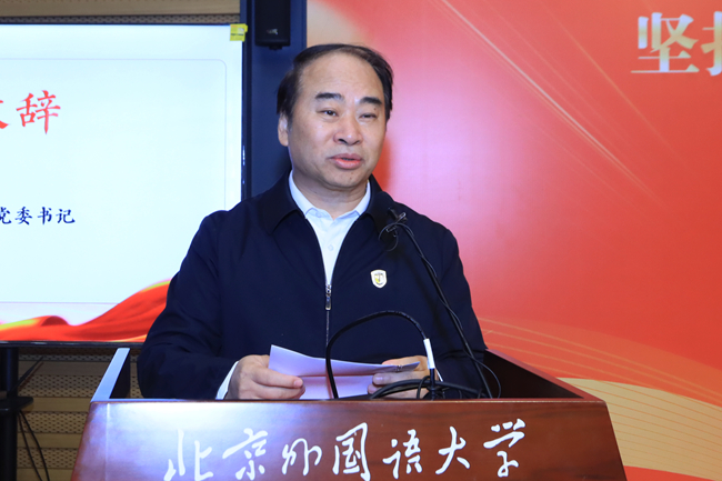 王定华在致辞中表示习近平总书记提出的“两个结合”重大论断与2021年习近平总书记给北外老教授们的重要回信精神高度契合,北外将以高度的责任感和使命感把世界介绍给中国、把中国介绍给世界。