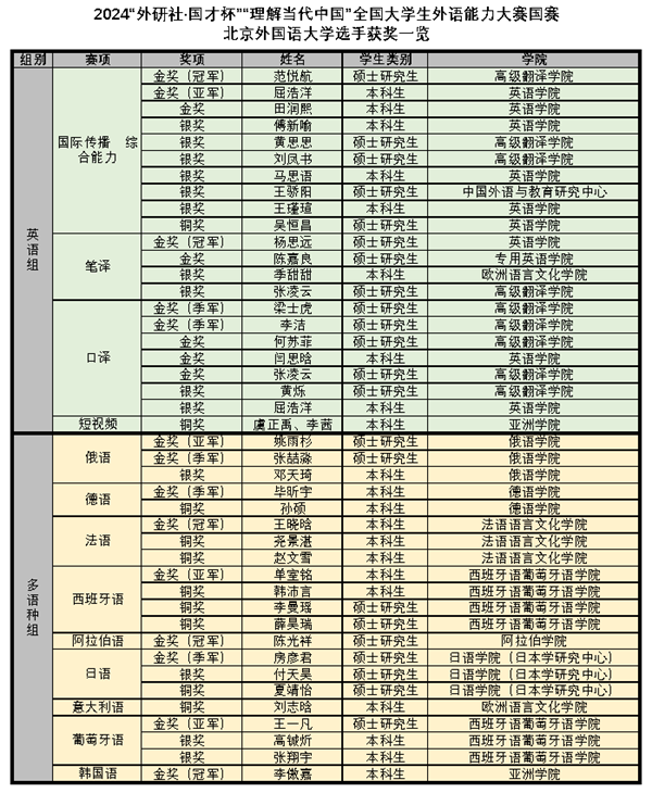 历经校赛、北京市赛、国赛三个赛段的激烈角逐,北外选手最终共有43人次(42人)获奖,共获得5个冠军、4个亚军、5个季军、19个金奖(含冠亚季军)、14个银奖、10个铜奖,北外荣获“优秀组织奖”。