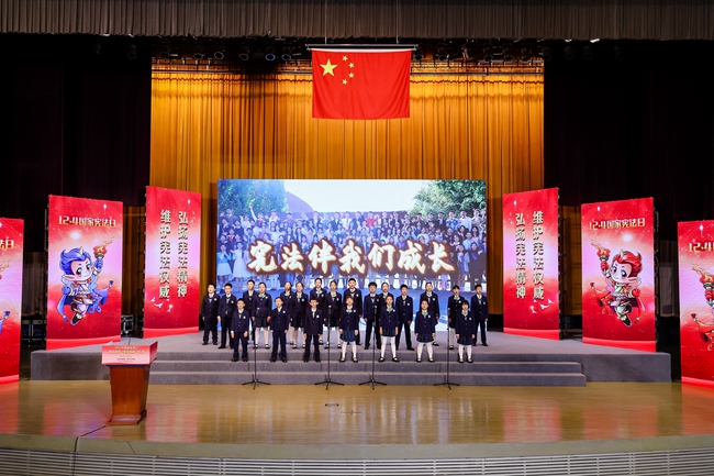 活动由北外全国青少年法治教育中心承办,在全国青少年学生法治教育实践示范基地设主会场,在全国各省(区、市)和新疆生产建设兵团设分会场。各地各校干部师生在线同步参与升旗仪式和“宪法晨读”,齐唱《宪法伴我们成长》主题歌曲。
