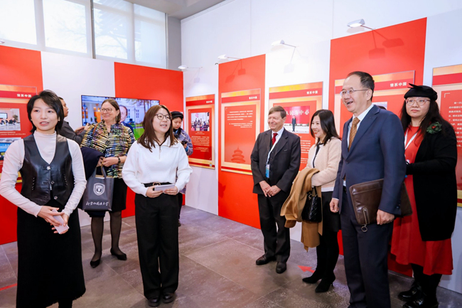开展仪式结束后,嘉宾们在讲解志愿者北外德语学院2021级本科生刘晨曦、2022级本科生黄婉茹的带领下参观了主题展。主题展共分为三个板块。第一板块“情系中国”介绍李夏德教授与中文和中国的结缘;第二板块“文心雕龙”介绍李夏德教授对奥地利维也纳大学孔子学院建设作出的贡献;第三板块“地利人和”是聚焦中国与李夏德教授的故乡——奥地利1971年建交以来的重要篇章。德语学院学生流利的德语、丰富的知识储备以及昂扬向上的精神风貌给嘉宾们留下了深刻印象。