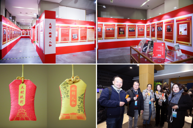 北外大学生创新创业项目非遗海外工作室苗喵绣设计并制作了开展仪式的伴手礼——“天时·地利·人和”御守香囊。香囊的设计理念体现了中国和奥地利文化之间的“和而不同”,一面绣以恢宏大气的金黄色北京天坛,另一面展现了奥地利美泉宫的典雅别致,以新颖的方式展现了文化交融之美,深受观展嘉宾的喜爱。