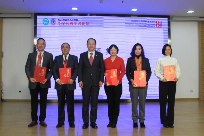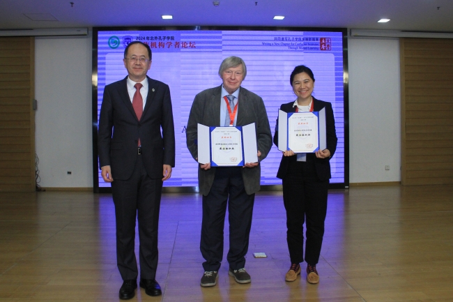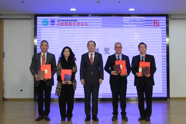 随后,贾文键为荣获2024年“SEE爱——我与孔院的故事”视频大赛“最佳组织奖”的2所孔子学院,以及荣获2023—2024学年孔子学院“优秀中方院长”称号的5位中方院长颁奖,为荣获基金会“孔子学院院长纪念奖章”的4位院长颁发纪念奖章和荣誉证书。