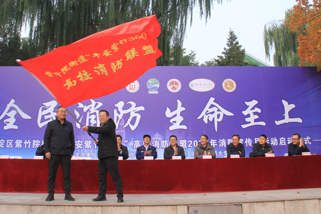 启动仪式上,上届活动承办高校中央民族大学向北外传递联盟旗帜。随后,倪文龙宣布紫竹院街道第二届“平安紫竹360°”高校消防联盟“119”消防宣传月活动正式启动。