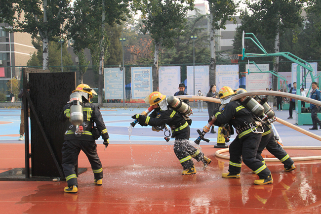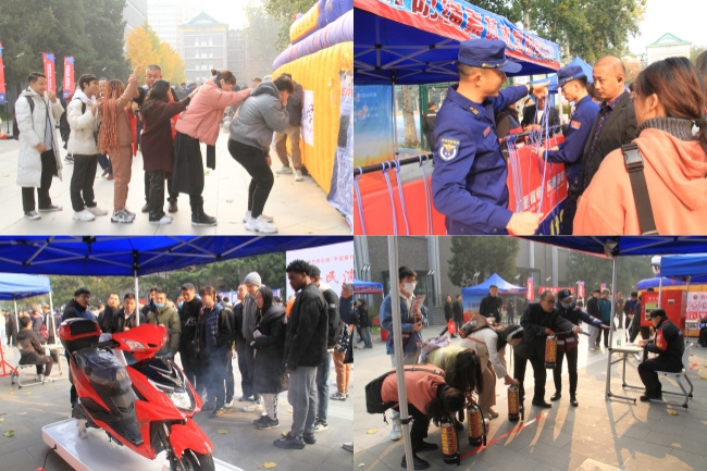 消防嘉年华环节设置了拥挤踩踏应急处置体验、烟热环境模拟逃生、模拟灭火器操作、模拟消火栓操作、油锅起火扑灭互动、消防VR互动体验、电动车火灾模拟演示、结绳技术互动、消防报警系统模拟操作、水带保龄球游戏、消防飞盘整改隐患游戏等11个项目,并安排中英文双语解说,充分展现了北外的外语特色。广大师生踊跃参与、受益良多。