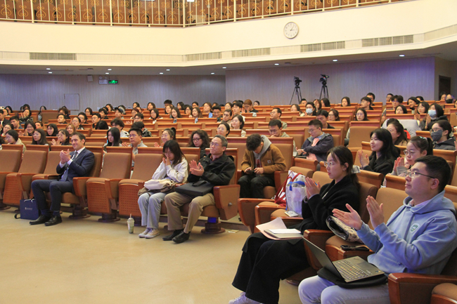 本次讲座由科研处和国际处联合主办,国际处处长和静主持。芝加哥大学校友关系与发展处执行处长David Cashman、北京中心代表李霞,北外国际处副处长龚婧、英语学院副院长张莲、国际教育学院副院长苑大勇,以及来自国际新闻与传播学院、高级翻译学院、英语学院、国际商学院、国际关系学院、中国语言文学学院、国际教育学院、亚洲学院、欧洲语言文化学院、法学院等教学科研单位的师生近300人参加讲座。