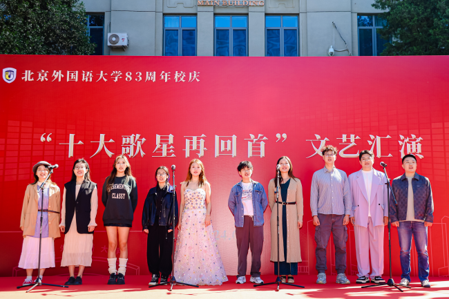 “十大歌星再回首”校庆文艺汇演在东校区主楼前拉开帷幕,本次活动吸引了众多校友、师生的参与和关注。汇演通过音乐的形式,传承了北外独特的校园文化,加强了校友与母校之间的深厚情感。演出现场,往届“十大歌手”代表演绎了多首经典曲目及原创作品,让在场的观众陶醉其中,掌声不断。活动的最后,在“人民需要我们到哪里,我们就到哪里”的校歌声中,全场校友一起为母校送上了最真挚的生日祝福。