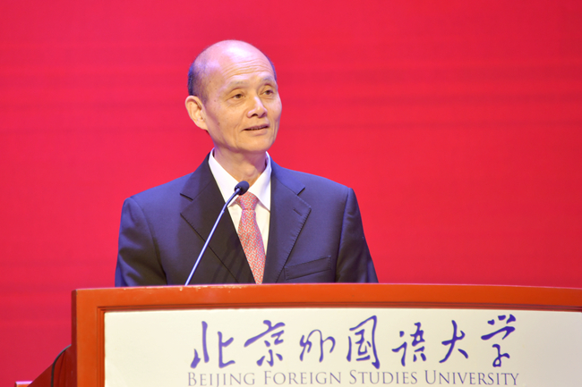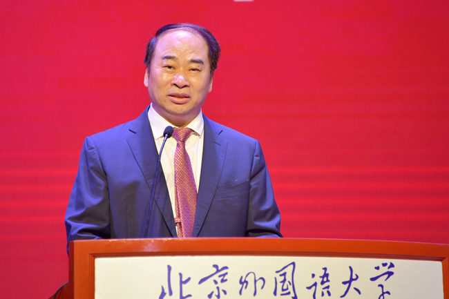 83级校友高岸明致辞,他表示,“兼容并蓄、博学笃行”的校训精神一路引航,让他将外语外宣锚定为终身求索的方向。希望青年学子继承北外光荣的传统和厚重的人文精神,用一代代北外人的理想和追求充实行囊、铸就华章,并对学科发展建设提出建议。