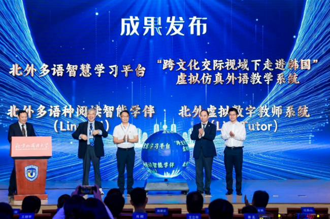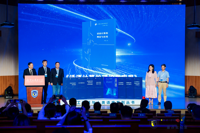 实验室主任李佐文教授主持成果发布仪式,现场发布了以北外多语智慧学习平台、“跨文化交际视域下走进韩国”虚拟仿真外语教学系统、北外多语种阅读智能学伴(LingPal)、北外虚拟数字教师系统(LingTutor)为代表的语言智能研发成果以及人工智能与人类语言系列丛书,包括《智能与赋能:中国外语教育数字化展望》《话语计算的理论与应用》《语言智能导论》《外语智慧教学研究前沿》《机器翻译质量深度评析与人机协同翻译》《会话含义理解的认知神经机制》《语料库数据驱动的外壳名词研究》《基于自然语言处理的翻译策略识别研究》。王定华、任昌山、北外网络教育学院荣誉院长、实验室首席专家顾曰国教授,中国人工智能学会语言智能专业委员会周建设教授,清华大学江铭虎教授,北京大学王厚峰教授,北外科研处处长张天伟,外研集团(外研社)党委书记、董事长,外研社社长王芳共同见证成果发布。