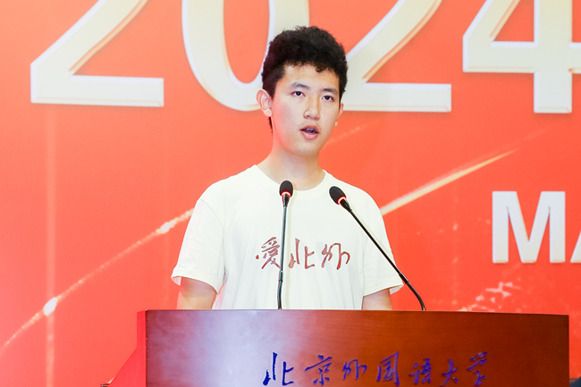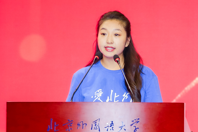 本科新生代表、阿拉伯学院的祝令贺结合自身经历,从“从何而来、为何而来、如何书写与北外的故事”三方面,阐述了对于全球化背景下外语专业的重要价值以及北外人肩负的时代使命的思考,号召同学们做勤奋求知的学习者、学以致用的实干家、志存高远的北外人,共同书写与北外的崭新篇章。