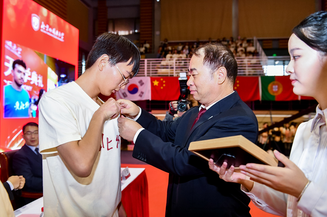 王定华为新生代表们佩戴校徽,并颁发校园卡。在场的全体新生一同佩戴校徽,正式成为“北外人”,肩负起“语通中外、道济天下”的北外使命和“人民需要我们到哪里,我们就到哪里”的责任担当。
