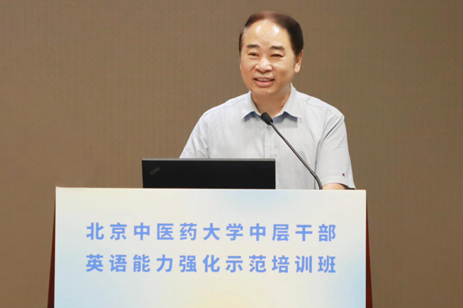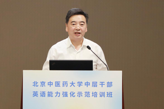 唐志书在致辞时表示,中医药学是中国古代科学的瑰宝,也是打开中华文明宝库的钥匙。习近平总书记对中医药工作多次作出重要指示,“要遵循中医药发展规律,传承精华,守正创新,推动中医药走向世界”。北京中医药大学始终立足世界中医药教育和文化传播前沿,努力把中医药文化打造成中外人文交流的亮丽名片。面向建设教育强国和健康中国的时代命题,必须打造一支专业强、视野宽的中医药国际传播队伍,全体参训学员必须全面强化英语实际应用能力,拓宽国际化视野。针对本次培训,他提出四点意见:一是要珍惜机会,学思体悟自我能力提升之“道”,不断提高中医药服务国家战略大局和外交大局的能力;二是要学用贯通,躬身践行学校事业发展之“术”,将所学所感所悟真正转化为解决问题、干事创业的专业素养和执行力;三是要开放心态,感受提升英语能力之“美”,让提升国际竞争力成为每一名干部的必修课;四是要从严从实,遵守学校党校和培训班之“纪”,要严格按照培训要求和教学安排进行学习,展现出北中医人的精神风貌。