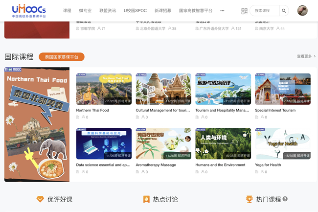 泰国国家慕课平台ThaiMOOC将提供泰国朱拉隆功大学(Chulalongkorn University)的“Data science essential and application(数据科学基础与应用)”,美法隆大学(Mae Fah Luang University)的“Special Interest Tourism(特色主题旅游)”,清迈大学(Chiang Mai University)的“Cultural Management for tourism(旅游文化管理)”“Northern Thai Food(泰国北部美食)”以及玛希隆大学国际学院(Mahidol University International College)的“Tourism and Hospitality Management(旅游与酒店管理)”5门课程登陆UMOOCs平台,促进双方优质资源共享与文化交流互鉴。