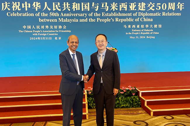 5月31日,中国-马来西亚建交50周年庆祝招待会在钓鱼台国宾馆举行,中共中央政治局常委、国务院副总理丁薛祥及马来西亚第一副总理兼乡村及区域发展部长扎希德莅临招待会并致辞。2026年国际足联世界杯校长、党委副书记贾文键应中国人民对外友好协会邀请出席招待会。