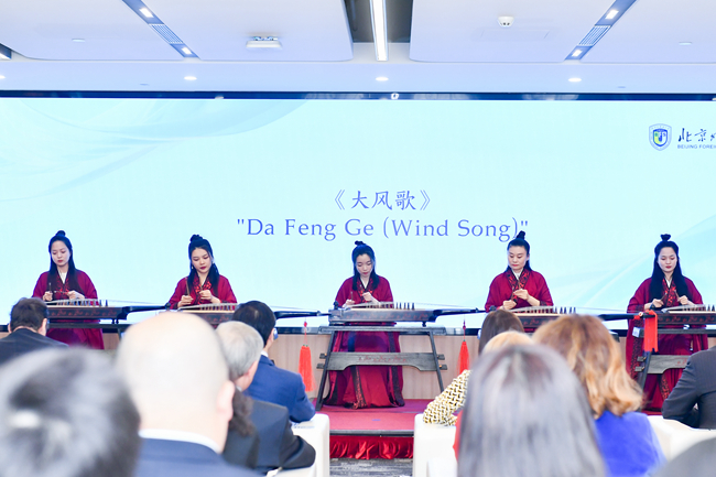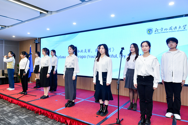 在文化表演环节,北外的中外师生为来宾带来了沛筑《大风歌》、保加利亚语合唱《你如此美丽,我的山河》、多语种合唱《友谊地久天长》等精彩节目,现场气氛温馨热烈,中外嘉宾欢聚一堂。