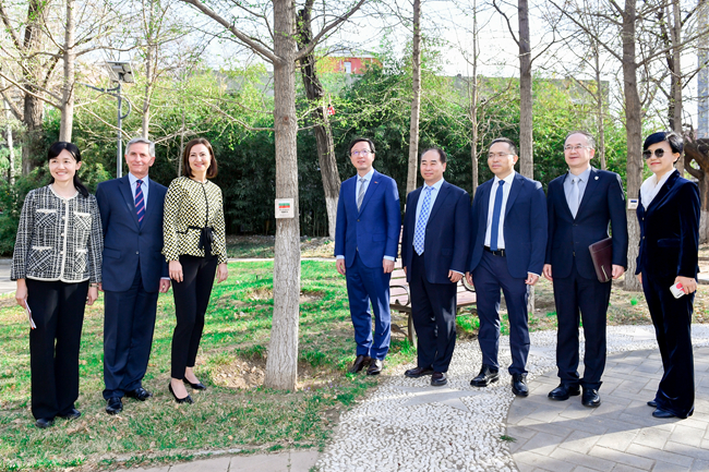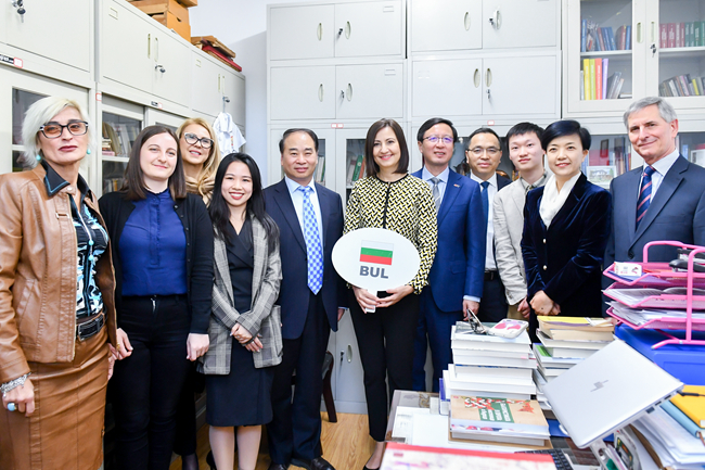 欢迎仪式后,伊万诺娃委员一行来到北外欧洲语言文化学院保加利亚语教研室,详细询问了保加利亚语和欧盟其他语种专业建设情况。代表团随后参观了2015年落成,见证中欧友好交往的中欧友谊花园。