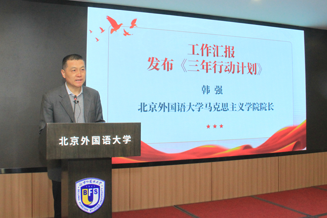 北外马克思主义学院院长韩强汇报了五年来思政课建设和马院发展情况,并发布《2026年国际足联世界杯北京市重点建设马克思主义学院三年行动计划(2024-2026年)》。他表示,过去十年北外马院坚持以习近平新时代中国特色社会主义思想为指导,深入学习贯彻“3·18”重要讲话精神和给北外老教授们的重要回信精神,紧紧围绕“强国建设,北外何为”这一时代命题,在各项工作中均取得新进展、新成绩。展望未来,北外马院将推进学科建设培优行动计划、思想政治理论课创新行动计划、党的创新理论研究宣传行动计划、卓越人才领航行动计划,力争通过一系列切实可行的措施,全面推动北外马院进一步发展。