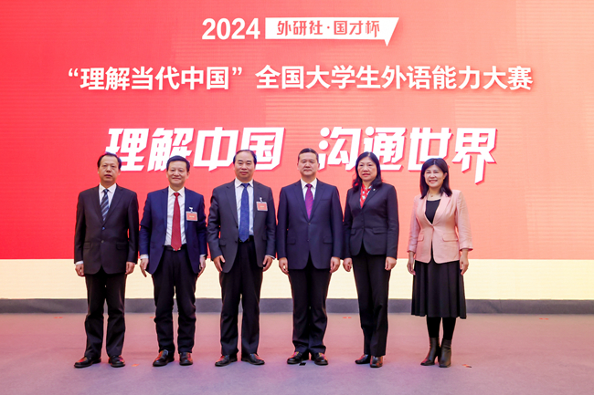 论坛同时启动2024“外研社·国才杯”“理解当代中国”全国大学生外语能力大赛,发布定题演讲题目The Chinese Dragon Is Good和短视频赛项题目“数字中国”。武世兴、王定华、孙有中、何莲珍、蒋洪新和王芳共同启动大赛。
