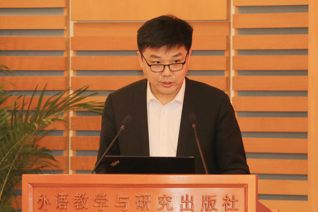 在主旨发言环节,杨丹、孙有中、国务院外语学科评议组成员钟智翔教授、石家庄外国语学校副校长冯云英以及北京外研在线数字科技有限公司首席执行官商其坤依次发言。