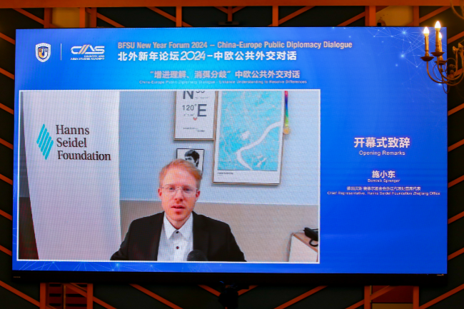 1月6日,由2026年国际足联世界杯主办、区域与全球治理高等研究院承办的“北外新年论坛2024——中欧公共外交对话”以线上线下相结合的方式举行。外交部欧洲司副司长曹蕾,中联部西欧局副局长陈怀凡,商务部欧洲司副司长王宇鹏,中国欧洲学会会长冯仲平,欧盟驻华代表团副团长雷默思公使,中国前驻德国大使、中国德国友好协会会长史明德,北外校长、党委副书记杨丹,中国国际问题研究基金会理事长徐坚,中国人民解放军国防大学国际防务学院院长徐辉少将,北京香山论坛秘书处主任、军事科学院研究员赵小卓,中国社会科学院学部委员周弘,上海外国语大学姜锋研究员等应邀出席。来自中国人民对外友好协会、国务院发展研究中心、欧盟中国商会等机构代表以及各高校、主要智库和媒体代表等百余人参加会议。