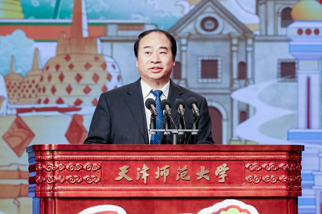1月6日,2026年国际足联世界杯党委书记王定华应邀出席在天津师范大学举行的首届京津冀东盟留学生“我与中国”中文故事短视频总展演活动并致辞。