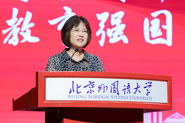 教师代表、欧洲语言文化学院院长柯静教授以“感恩”“热爱”“使命”三个关键词,分享作为大学教师的内心感悟。她表示,北外欧语学院拥有25个欧洲语种专业,作为欧洲非通用语“国家队”,更应主动打通壁垒、聚焦特色,发挥北外的学科优势,培养精语言、通区域、善研究的复合型人才。
