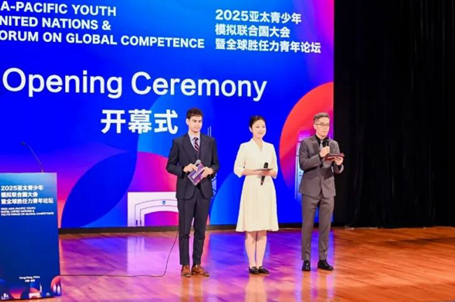 开幕式由凤凰卫视著名主持人、北外校友安东,北外学生章文天和清华大学留学生Diego Rodriguez共同主持。在接下来的会期中,与会青少年将围绕“人工智能技术共享与国际合作”“非物质文化遗产保护”“蓝色经济与海洋资源可持续开发”等全球性议题展开深入研讨,通过多边协商,共同擘画全球可持续发展的蓝图。