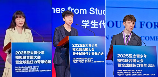 来自宁夏银川一中的冉妍、新加坡国际学校(香港)的顾骏珀以及北外的留学生Vlasovskiy Artem作为参会代表发言,分享了他们对全球治理与可持续发展的思考,表达了对本次活动的期待。