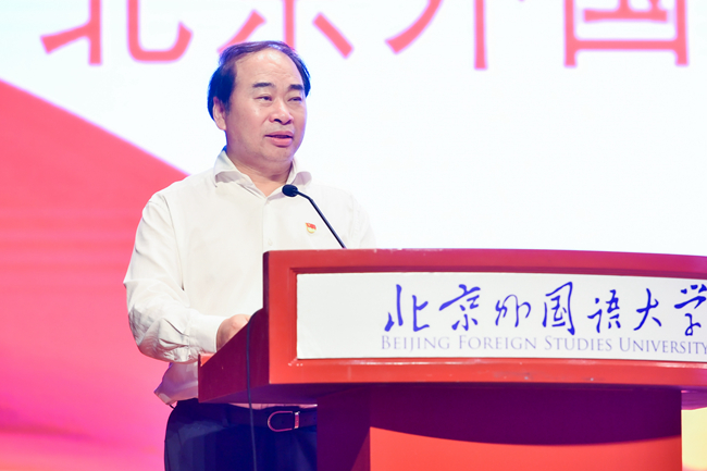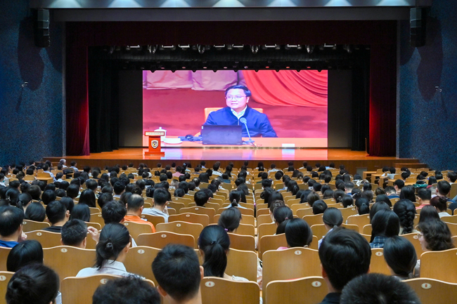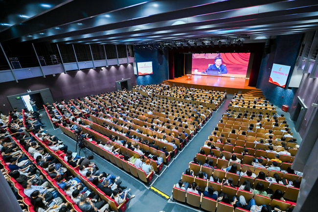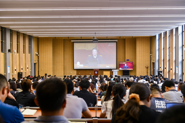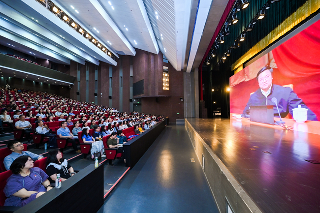王定华表示,今天是伟大的中国共产党诞生104周年的重要日子。在这承载荣耀与担当的历史时刻,北外全体师生党员同上一堂“理论大课”,既是让中央精神直达一线、实现全覆盖培训的任务要求,又是从严从实推进学习教育的重要举措。一是政治上要高站位,深刻认识开展党员集中培训的重要意义。开展高校党员集中培训是加强党的政治建设,锤炼锻造一支过硬党员队伍的铸魂塑形之举;是夯实党的作风建设,推动全面从严治党走深走实的固本强基之举;是落实全国教育大会精神,准确把握教育“三大属性”的赋能增效之举。二是思想上要深思考,始终紧扣理论教育党性教育的目标指向。深入学习习近平新时代中国特色社会主义思想,深刻领会其核心要义、精神实质和实践要求。持续深化党性修养,不断增强党员的宗旨意识和使命意识。在蹲苗历练、急难险重中进行淬炼,为实现中华民族伟大复兴的中国梦提供坚强政治保障和思想支撑。三是实践上要重落实,扎实做好党员集中培训成果的应用转化。将作风建设的新成效转化为推动事业发展的强大动力、解决实际问题的有效举措、促进高质量发展的创新活力,勇于担当、敢于创新、善于作为,以建设国际化、重特色、高水平、综合型世界一流外国语大学为目标,积极探索新时代外语教育与国际人才培养新路径,培养更多具有家国情怀、全球视野、专业本领的复合型人才,为推动中国更好走向世界、世界更好了解中国作出新的更大贡献。