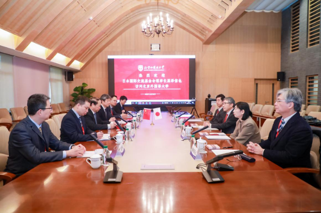 研讨会开始前,王定华分别会见了金杉宪治一行、黑泽信也一行及前来参会的专家学者代表。王定华就基金会多年来对北外的大力支持表示感谢,并介绍了北外“外特精通”办学理念及学科建设、人才培养等方面情况,尤其是日语学科近年来的发展成绩。他表示,期待双方继续拓展合作,加大经费支持,将中心建设成为重要的研究和人才培养基地,更好架起中日友谊、民心相通的桥梁。黑泽信也对北外的热情接待致以谢意,对北外及北外日研中心近年来的发展成就给予充分肯定。他表示,希望北外建设取得更大成绩,期待双方携手推动日本学研究取得更大进步。金杉宪治表示,将为北京日本学研究中心发展提供持续支持。