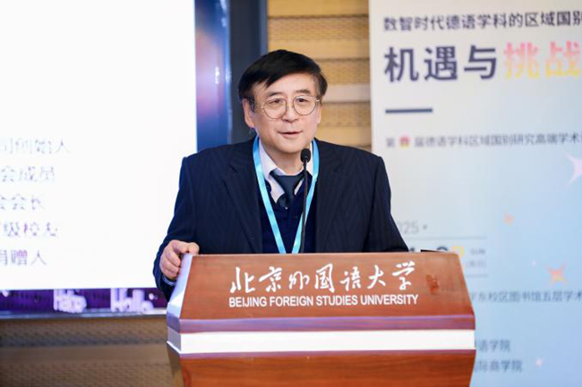 贾文键在致辞中表示,北外始终与国家的发展同频共振,为党育人、为国育才,在区域国别研究领域做出了积极的探索。面对汹涌而来的数智化浪潮,北外德语学院和国际商学院成功联合申报“德语+大数据管理与应用”双学士学位人才培养项目,是构建数智时代“语言+技术”复合型人才培养范式的主动作为,前景可期。两家学院携手以“数智时代德语学科的区域国别研究”为主题邀请学界专家和行业精英交流研讨,极具前瞻性和必要性。同时,贾文键对校友们长期以来给与母校学科建设和人才培养的大力支持表达了诚挚的谢意,希冀在学术交流中收获更多数智时代的治理方案,迸发出更多的人文火花,凝聚更多的育人智慧。