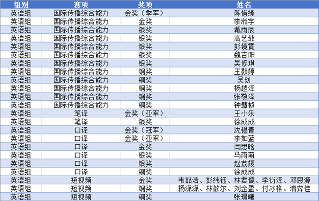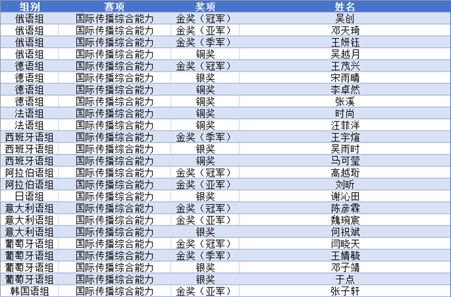 北外本次有45名(组)学生(共53人,55人次)获奖,包括6项冠军、6项亚军、4项季军,19项金奖(含冠亚季军)、14项银奖、14项铜奖。北外获“优秀组织奖”。
