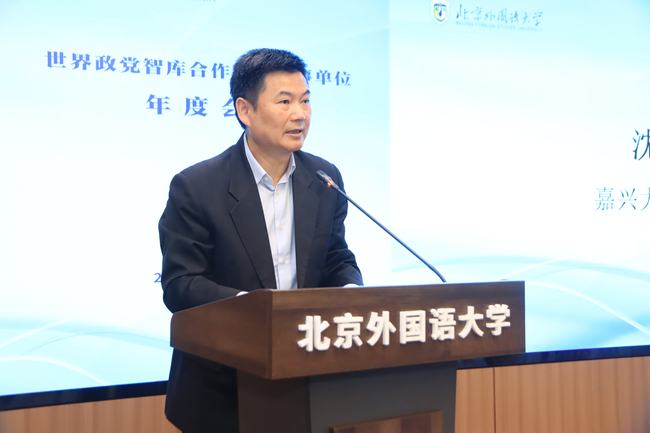 理事单位负责人发言交流环节,北外党委副书记贾德忠、复旦大学国际关系与公共事务学院教授郭定平、嘉兴大学浙江(嘉兴)中外政党研究中心主任周淑真、山东大学世界政党研究中心主任王韶兴、广西大学校长助理徐秦法等分别代表本单位进行了工作汇报。贾德忠在发言中表示,在中联部的领导下,北外未来将充分利用好自身多语种优势,把联盟秘书处平台维护好,把全国政党研究力量和智库资源统筹好,把中外政党智库的交流与合作开展好。